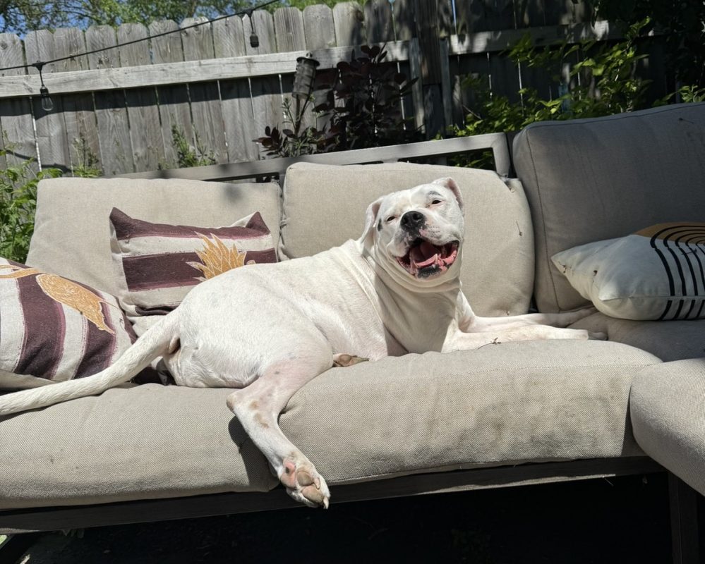 If loyalty had a face, it would look like Chu Chu’s — big soulful eyes, a broad grin, and just the slightest bit of drool when she’s happy (which is, honestly, most of the time). Chu Chu isn’t just an American Bulldog — she’s a one-dog security system, therapist, and best friend wrapped in a soft, snuggly, 85-pound package of love.
