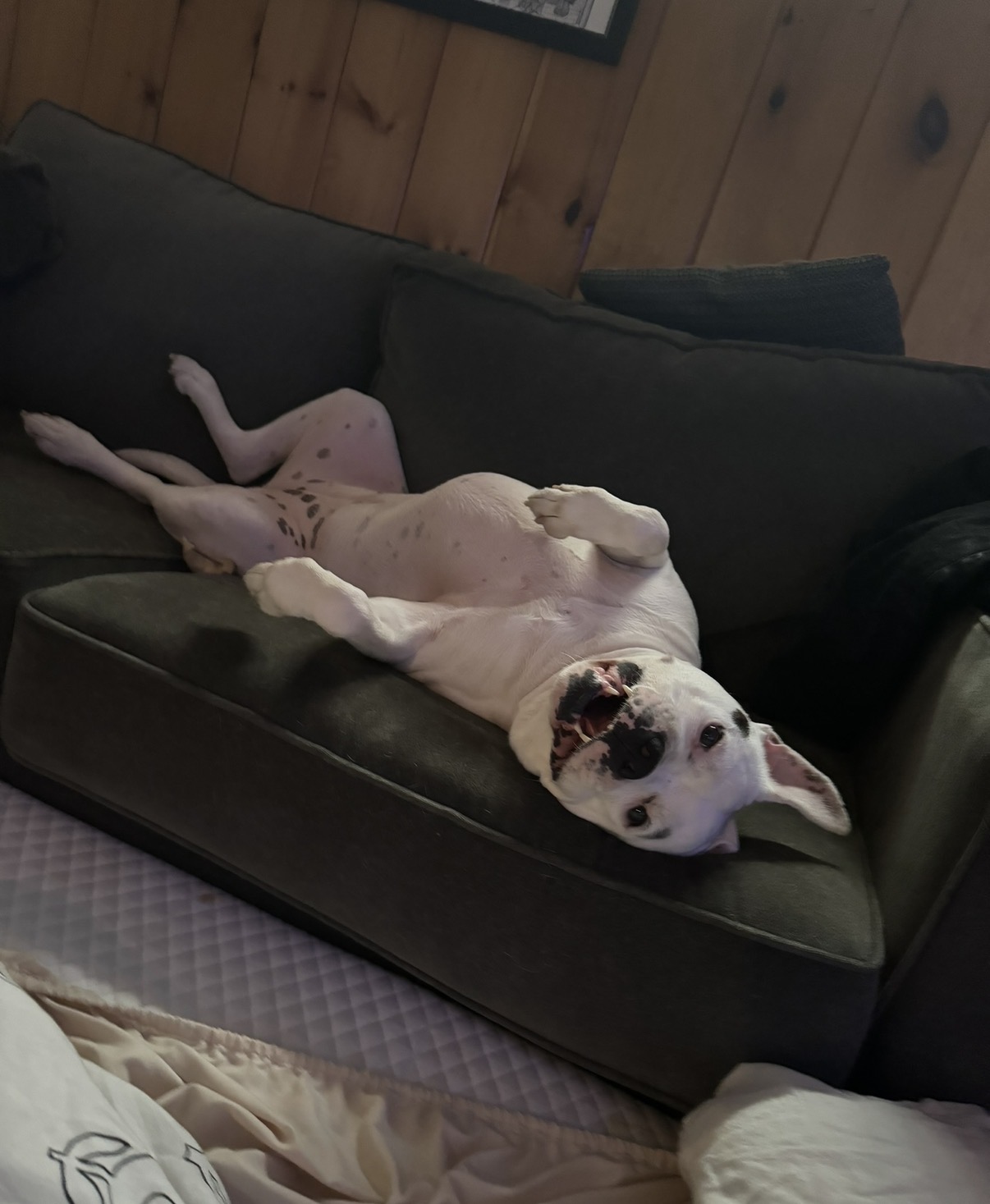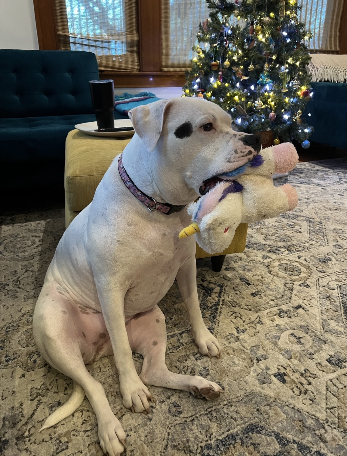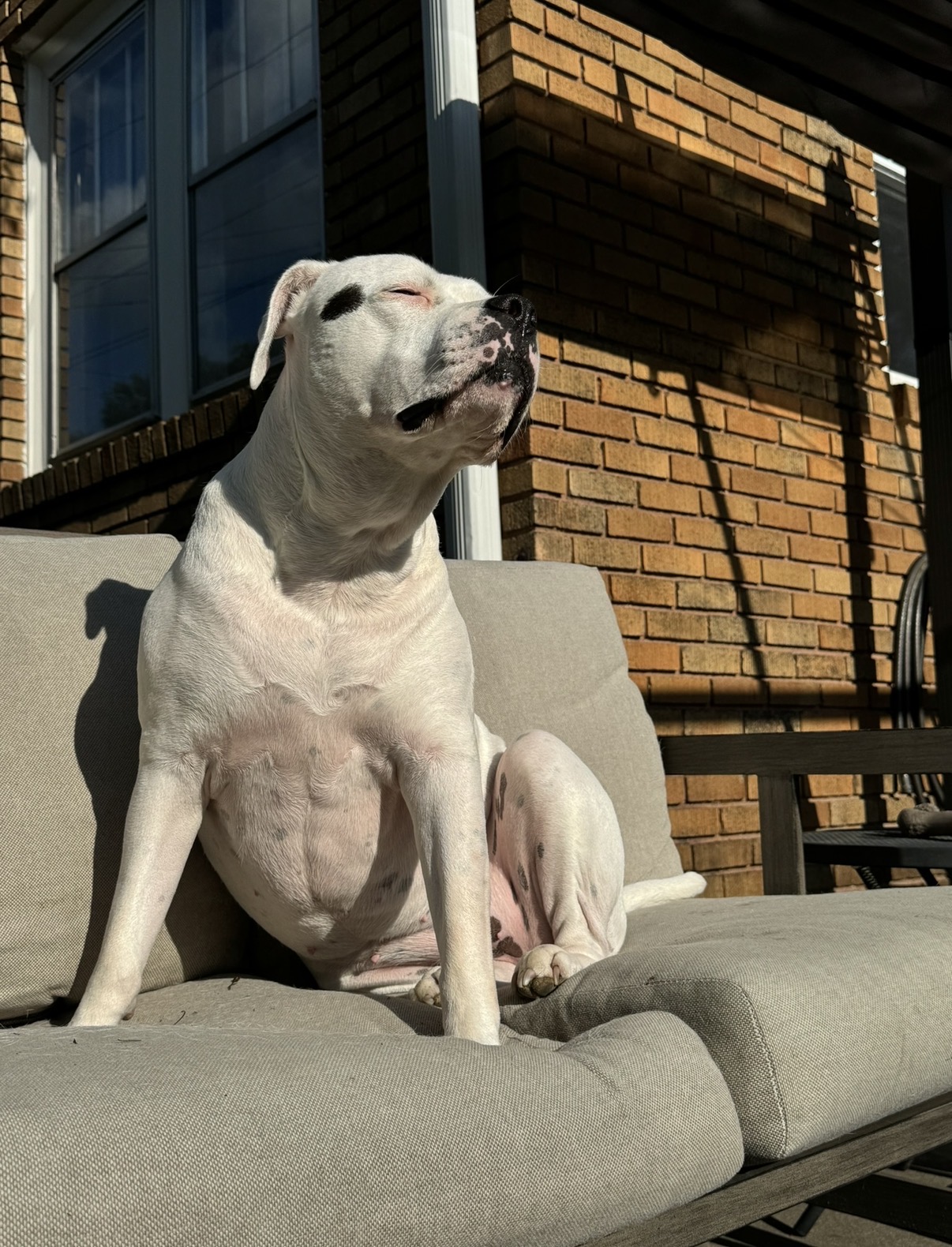 If loyalty had a face, it would look like Chu Chu’s — big soulful eyes, a broad grin, and just the slightest bit of drool when she’s happy (which is, honestly, most of the time). Chu Chu isn’t just an American Bulldog — she’s a one-dog security system, therapist, and best friend wrapped in a soft, snuggly, 85-pound package of love.
