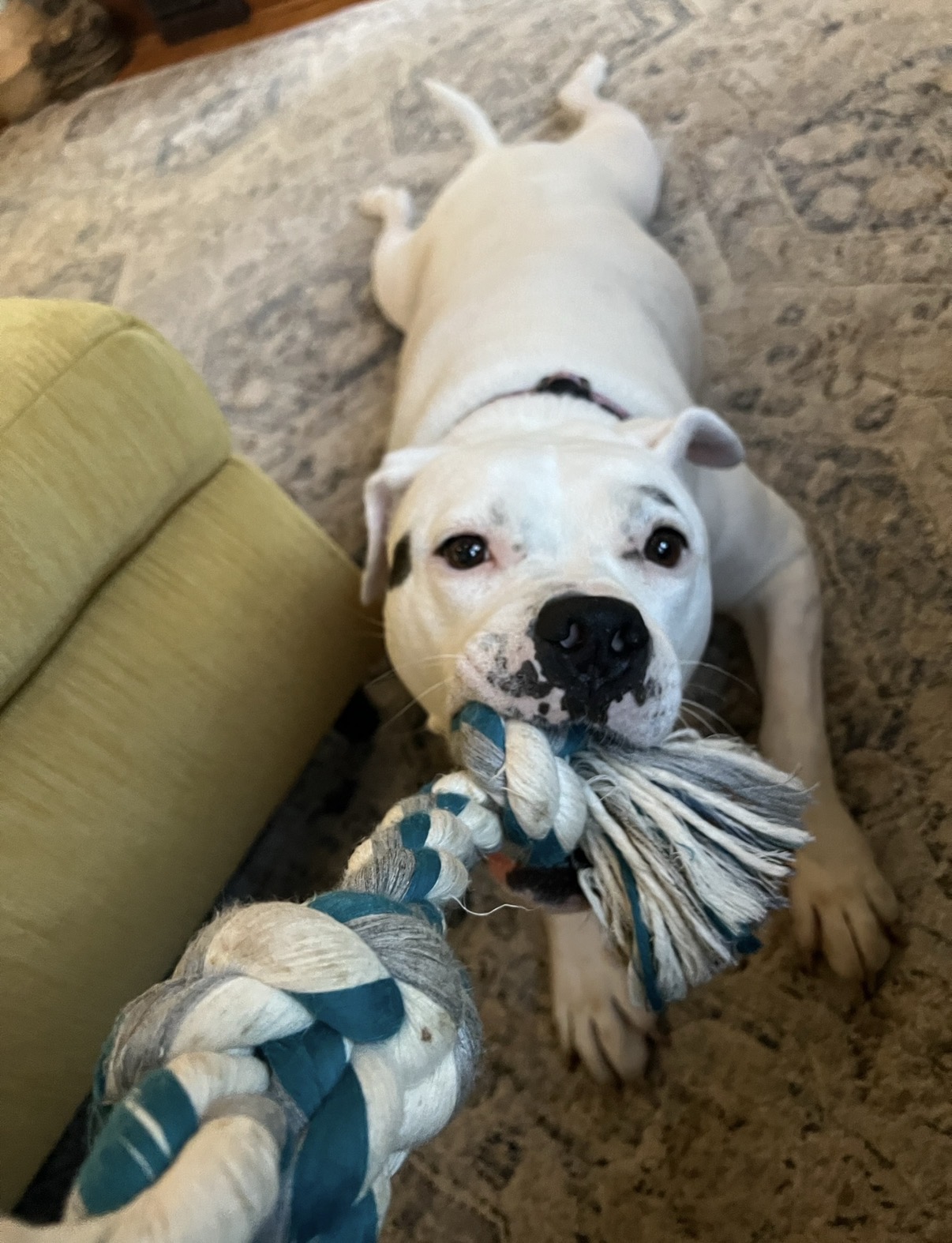 Chu loves being dragged around by her rope. American Bulldogs were bread do hunt wild hogs and when they would latch onto one they would go limp and allow the hog to tire itself out before they finished the job. Dragging her around helps fill that instinctual need.