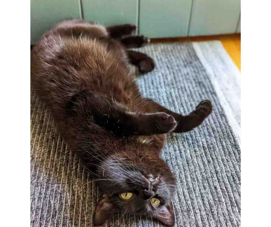 She is the sweetest little kitty and very playful. While she’s not a big meower, she loves to communicate with us by sort of chirping at us when she wants to play or if we’re behind schedule on feeding her. It’s so cute. She loves to show off her tricks, like scratching the scratch posts or scratch pads, and she loves to jump up for her toys on a little ledge we have and then get praise for it – again, it’s the cutest thing. She’s definitely not a lap cat, but she does love to hang out with us and be next to us during TV or reading time.