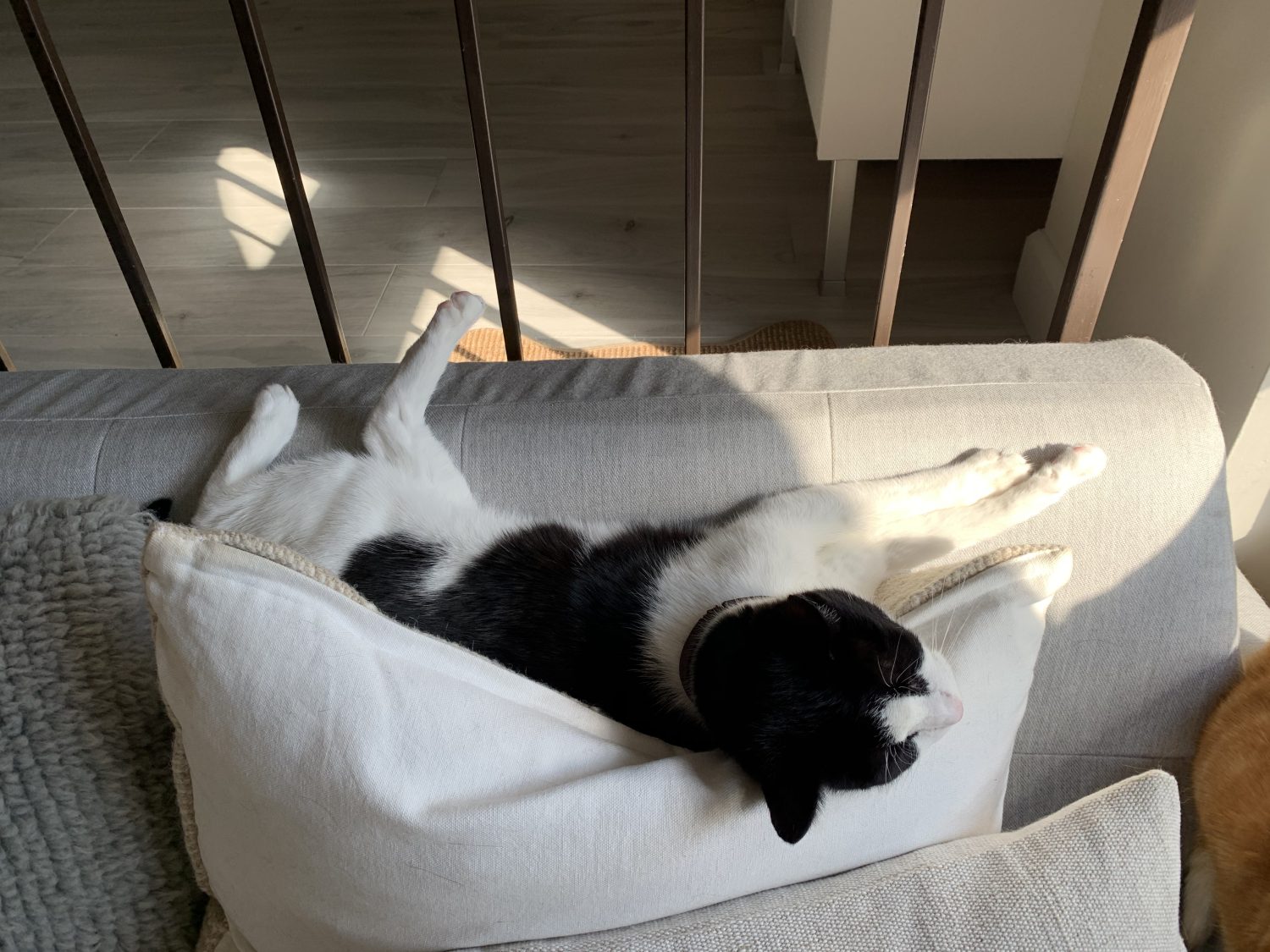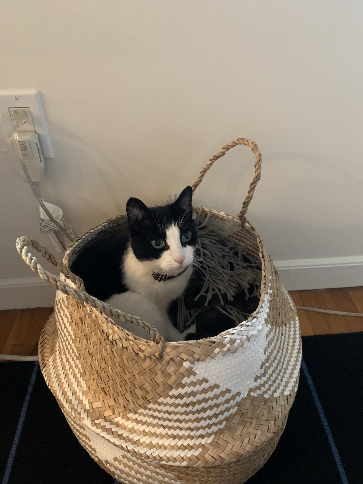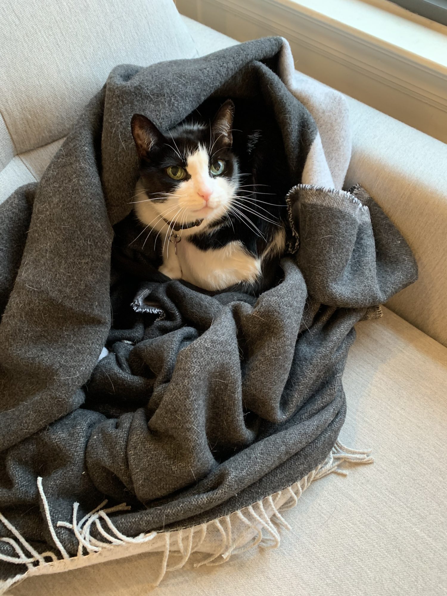 At 17 years young, this petite black-and-white tuxedo queen has perfected the art of living with equal parts dignity and mischief. She greets guests at the door like a hostess from a bygone era — gracious, curious, and just a little opinionated. Her fur is sleek, her eyes are wise, and her purr? That’s the soundtrack of home itself.
