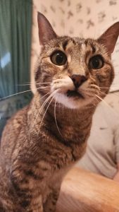 Very vocal and likes things on her terms as she’s very skittish at first. Not a big player, but loves lounging around all day. Not a fan of being picked up, will growl but has never used claws. She’ll remain still and growl until put down again. EXTREMELY food motivated. Takes time to warm up to a person. Favorite thing to do is sit with you while watching tv. Always talking-loves to greet you when you enter the room (please meow back her, it makes her happy)