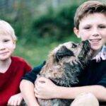 2 boys posed with a senior dog