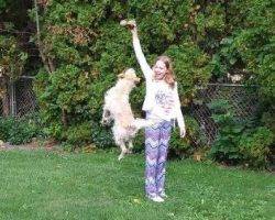 When we throw Scruffy his Kong bone, he uses his front paws to catch it and bring it to his mouth. When he sees our granddaughter come in to visit he jumps almost 5 feet straight up in the air in excitement.