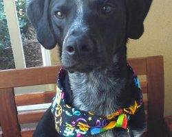 Dex is mostly black, and has the neatest spotted socks and chest (From the Pointer side of the family). He likely has Labrador Retriever in his heritage as well, and would excel as a sporting companion/retriever.