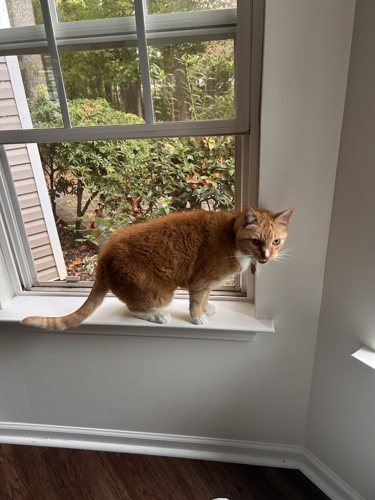 He sits on the window sill and makes funny noises when he sees people or birds on the street.