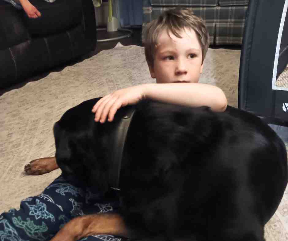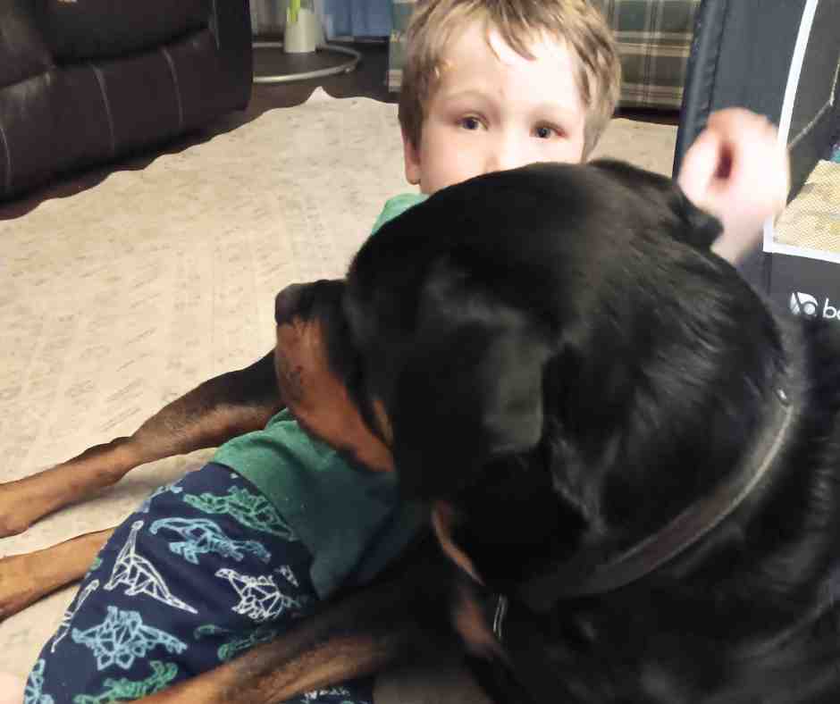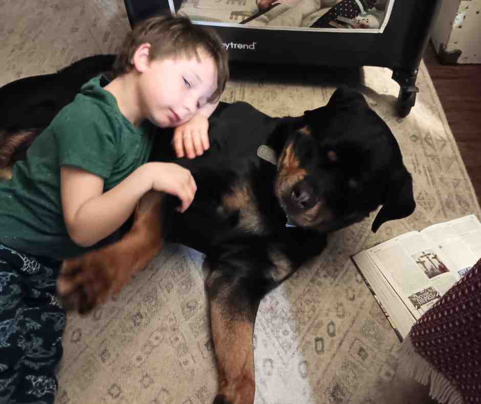 She would lie down with my baby while they lay on their play mat. She would always be close to the baby, protecting them. She also loves sleeping near my boys.