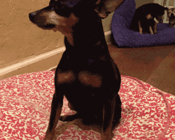 I am Nico, a black and tan 9 year old Mini Pin. My amigo shown to the right of me, is Scooter. Scooter is a little older than me (age 11) and a little bigger but lacks my snappy sense of style, he’s used to meeting people at the door and likes catching rats (if you need that sort of thing). I am more of a watch dog that barks than a “go get ’em” sort of pup.